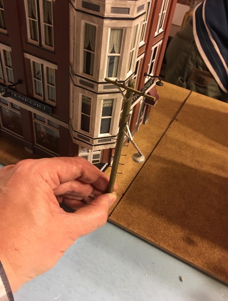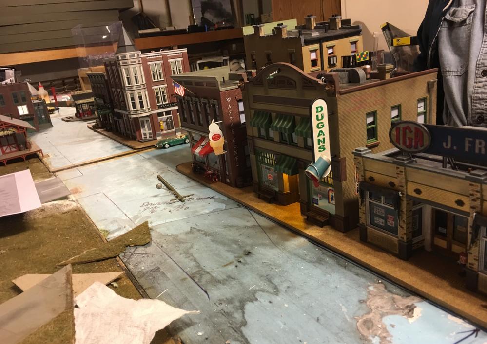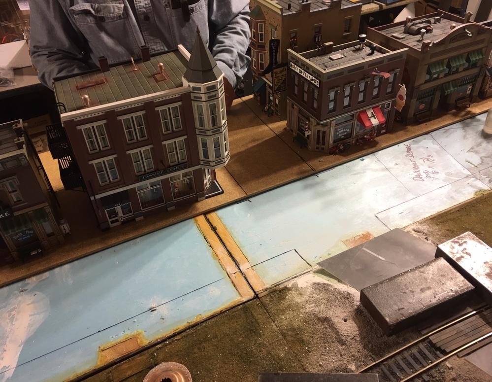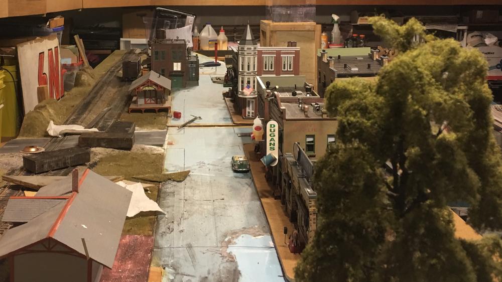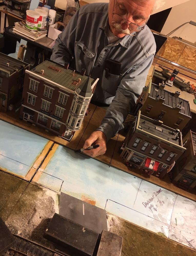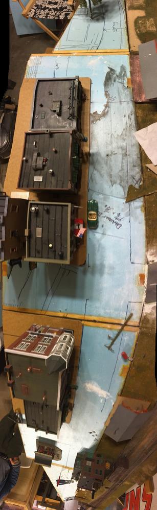 Cutting the masonite and test fit of the structures and trees is the fun part. The blue styrofoam is where the street will be. Likely Railroad Avenue.